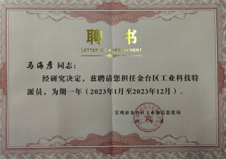 2023年4月3日下午,由宝鸡市金台区工业和信息化局组织的金台区2023年度科技特派员工作会在金台区大数据园召开,市、区相关领导参加会议,会上,必发集团经理马海彦被聘为金台区工业科技特派员。