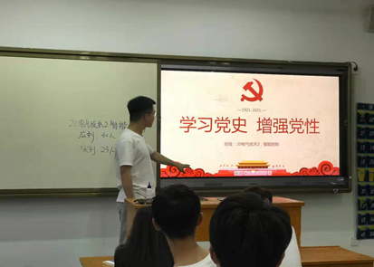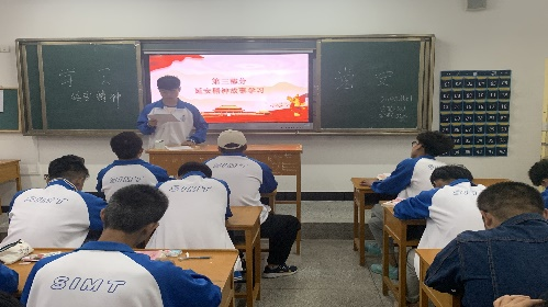 各班团支书及团员们积极开展党史学习内容的分享,20电气技术1班王壮分享的题目是《论延安精神》,随后全班同学共同观看《百炼成钢:中国共产党的100年》。20智能控制班吕鑫分享《学习党史 增强党性》,20机械制造班曹琦分享《学习五四运动 弘扬五四精神》,会上同学们畅所欲言,沟通思想,增进共识。20机电技术2班,全班同学合唱《国歌》、《歌唱祖国》等歌曲,侯永旭分享《浴血百年路,启航新征程》,随后全体同学齐声诵读《七律·长征》,团员代表郝志峰等讲述《王二小的故事》、《抗日英雄杨靖宇》等红色经典故事。