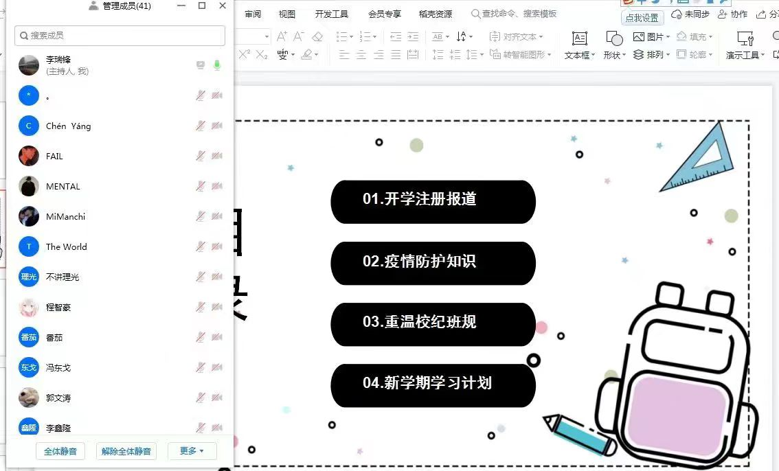 9月1日晚自习期间,必发集团老生各班级班主任、辅导员通过腾讯会议、微信直播等线上平台,为员工开展了别开生面的“开学第一课”主题班会。