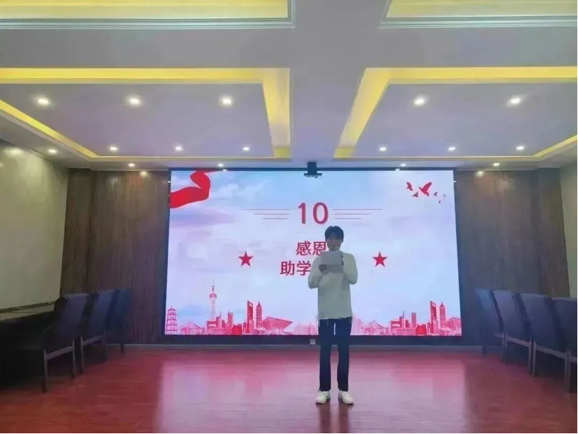 比赛环节之后,同学们观看了国家资助政策微电影,更加认识到资助政策的重要性。之后,有几名同学也用歌声表达了对国家资助政策的感谢。曾炫俊同学给大家带来一首《自打来到这人世间》,张玉莹和刘知远同学合唱了《年少有为》,于晨晨同学演唱了一首《十年》。