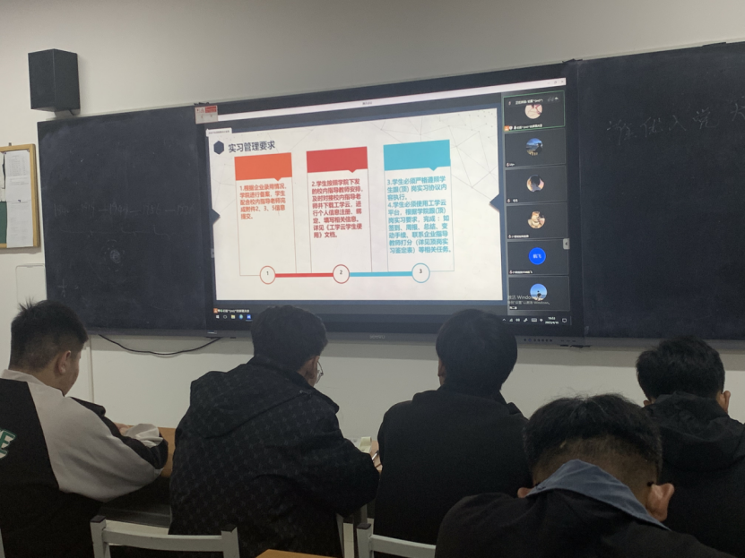 4月2日班会期间,公司邀请公司人才招聘处校企合作科科长王博老师为全体员工和辅导员、班主任分析目前就业形势。4月16日班会,公司教学管理科科长姚莹老师向同学们讲解顶岗实习中的许多注意事项。