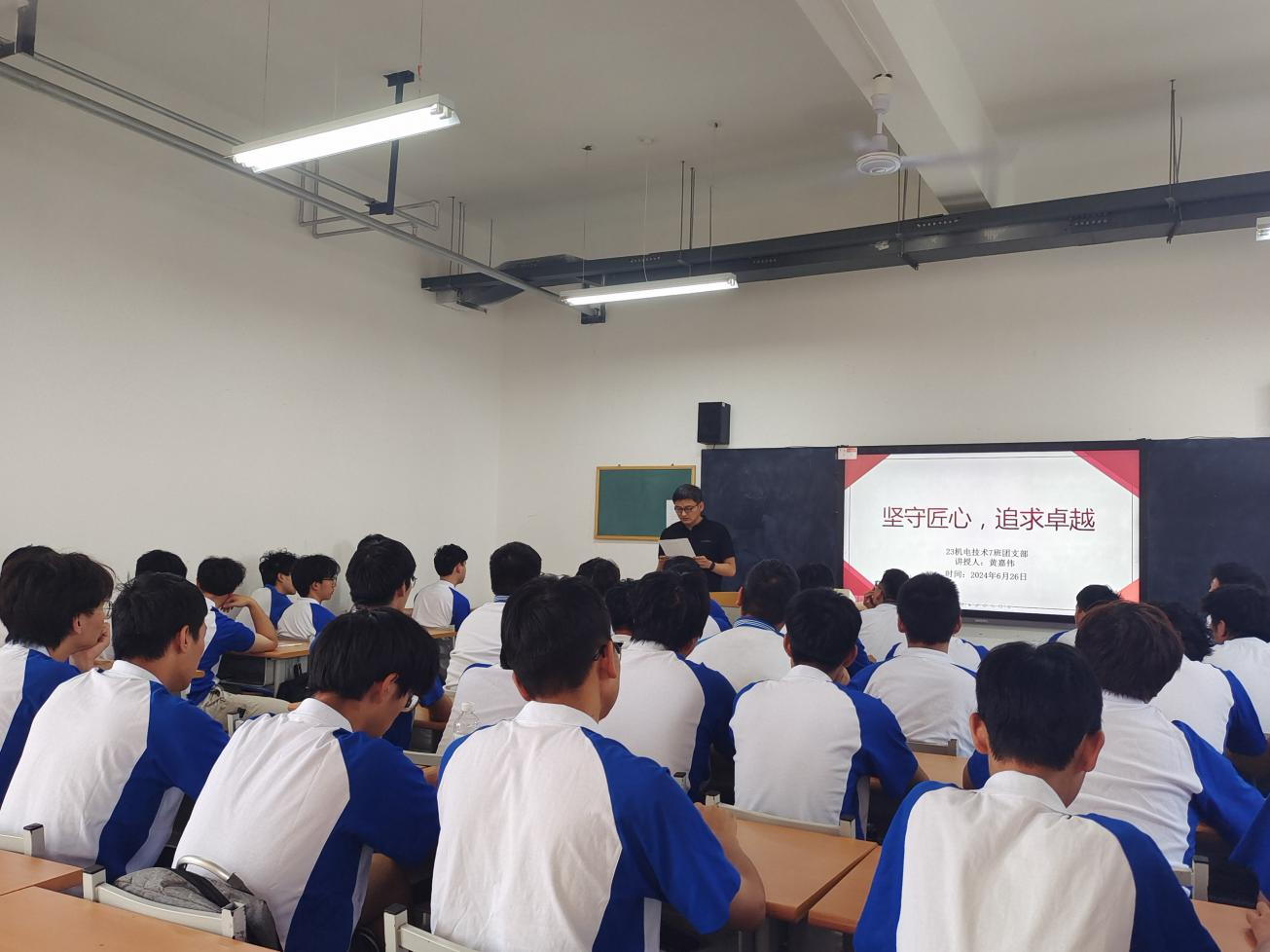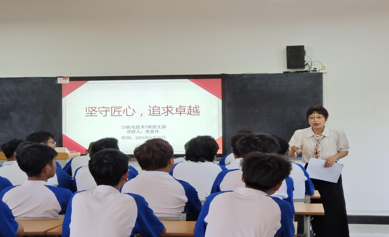 2024年6月26日上午,23机电技术7班团支部在博学楼317教室开展以“坚守匠心,追求卓越”为主题的团日活动,活动由团支部书记黄嘉伟主持。校团委书记王枢、各二级公司学工办主任、团总支书记、副书记应邀观摩。
