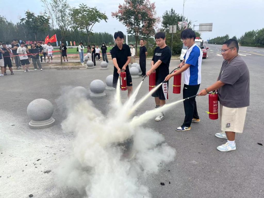 随后各班级代表出列参与了使用消防器材灭火行动。同学们在王老师的指挥下,手持灭火器,紧张而有序地进行着灭火行动。