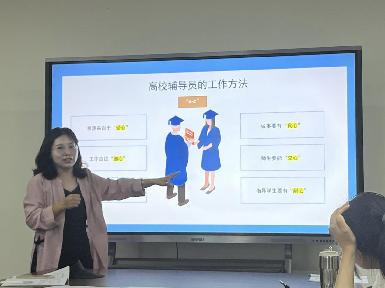 会议伊始,由专职辅导员苗梅梅老师分别从高校辅导员角色认知、工作内容及工作方法三个方面进行经验分享,苗梅梅老师分享辅导员工作要做到“五力”,即充分发挥员工自我管理的“动力”、要会“借力”、要会给“压力”、要发挥“亲和力”、要会使用“感召力”。更要具备“六心”的基本素质,即根源来自于“爱心”、做事要有“良心”、工作应该“细心”师生要能“交心”指导员工要有“耐心”。最后,苗梅梅老师总结到:作为新时代的辅导员,在教育服务、管理指导员工过程中,要厘清服务与管理的辩证关系,认清自己的角色定位,在员工成长过程中扮演的身份等,我们要结合员工特点和公司产品特色,真正了解员工动态、用心走进员工内心、用理暖化教育员工、用情服务管理员工,构建起师生之间坚实的友谊桥梁,增进员工认同感,引领员工成长成才。