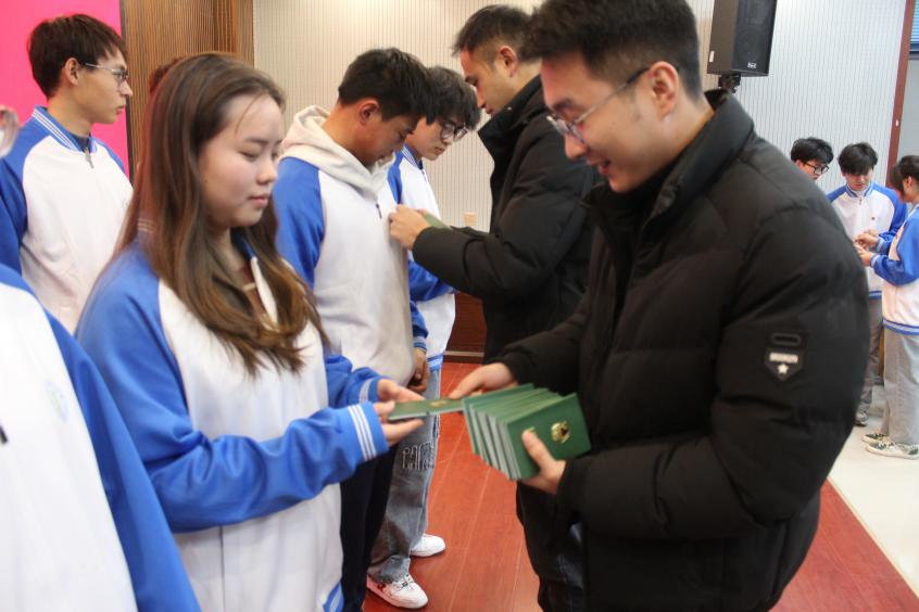 紧接着,由团总支书记,团总支副书记,各专职辅导员及老团员代表班文洁同学为新团员代表颁发团员证、佩戴团徽。一枚枚团徽闪耀在新团员胸前,这是荣誉的象征,更是责任的寄托。
