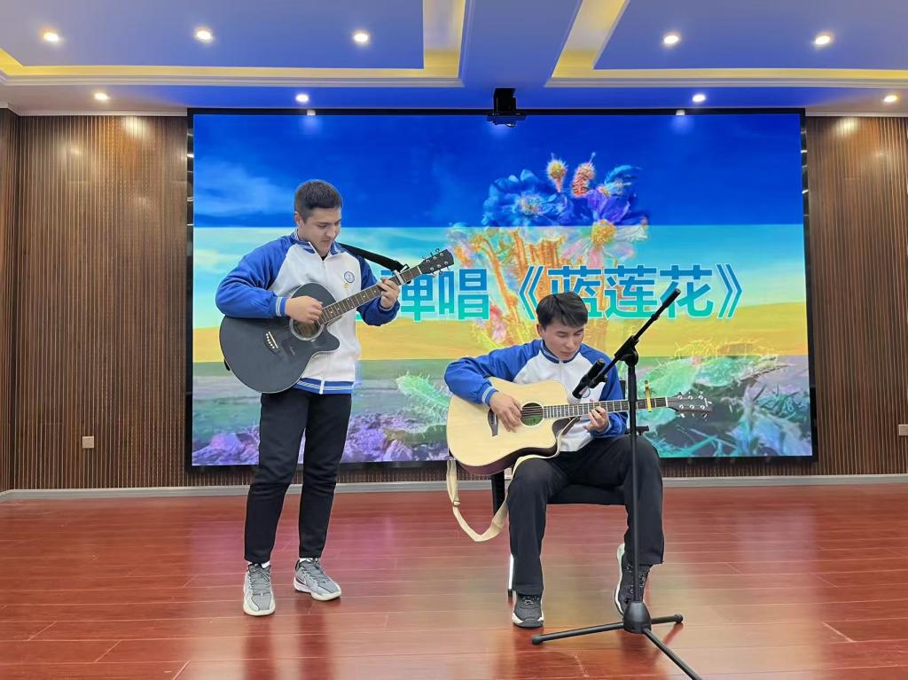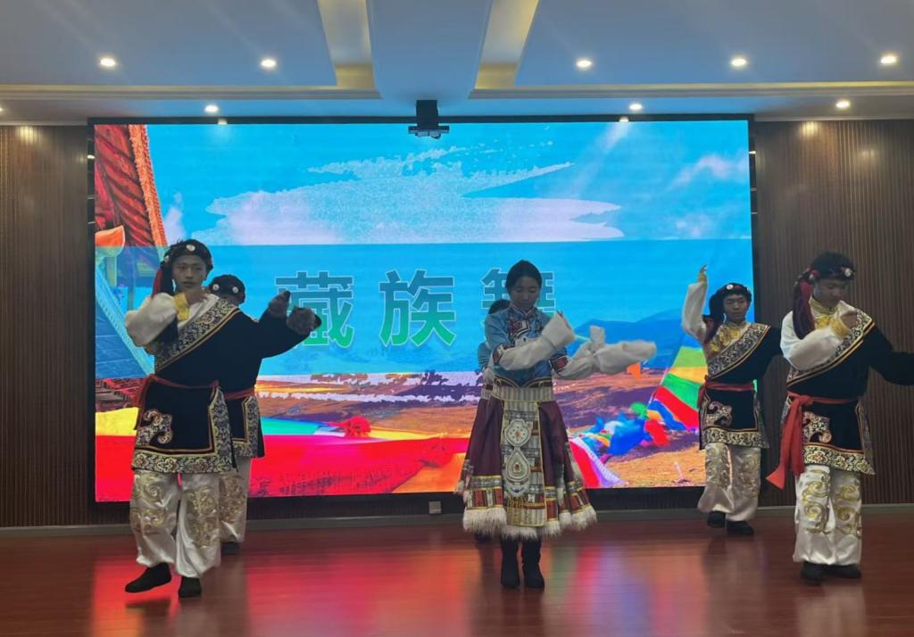 第四项议程的才艺展示,让现场热度持续攀升。依力亚尔・牙森与买尔丹江・买买提艾力携手弹唱《蓝莲花》,清澈歌声交织着灵动吉他旋律,将对自由与理想的执着追求娓娓道来;艾柯代・吾布力哈斯穆的新疆舞独舞热情登场,轻盈舞步踏出浓郁民族风情,真挚情感感染力十足;尼玛朗加等六位同学演绎的藏族舞蹈则尽显豪迈奔放,舒展舞姿间勾勒出雪域高原的辽阔意境与深厚情怀。