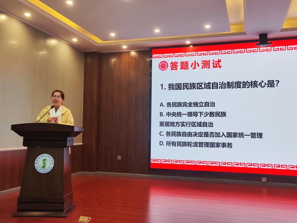 紧接着的“石榴籽知识竞答” 互动环节趣味十足,现场欢声笑语不断。竞答题目涵盖民族政策、民族特色习俗等内容,同学们踊跃举手、争相作答,在答题过程中收获知识、增进情谊。
