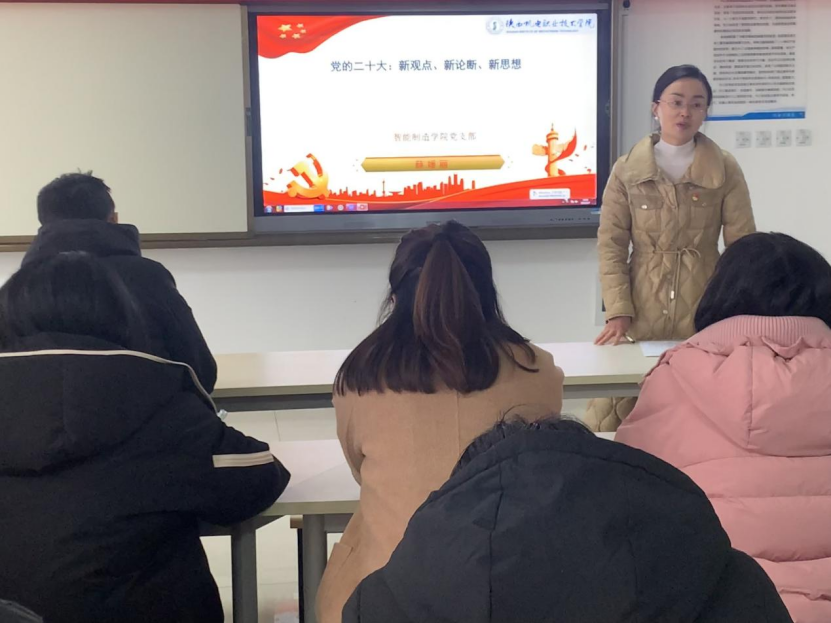 公司党支部于2023年2月7日下午,在汽车机电大楼502教室开展题为《党的二十大:新观点、新论断、新思想》党的二十大精神宣讲会,党支部书记薛媛丽做宣讲,全体党员同志到场参会。