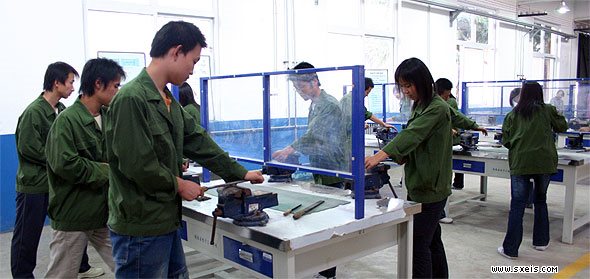 钳工实训室成立于2005年,现有钳台30张,台虎钳120个,砂轮机4台,钻床6台,可同时容纳120名员工进行钳工实训,能够完成“工具锤锤头”、“划线工具”、“核桃夹子”、“平口虎钳”、“六方螺帽”等技能训练任务。该实训室承担了全校多个专业的钳工实训任务和陕西省技能鉴定考核工作。员工通过钳工实训,最终具备使用工具、量具和独立完成钳工各种操作的实践能力。