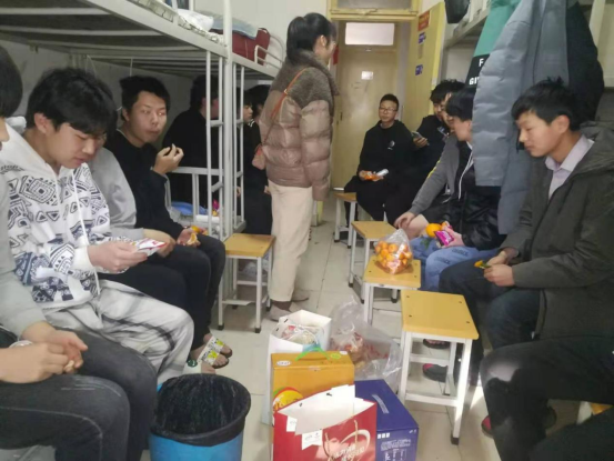 2022年1月16日下午,公司党支部书记薛媛丽携教师代表李小曼、胥伟鹏、孙钊、周东一行5人,来到宝福路校区9#公寓寒假留校员工宿舍,看望慰问因疫情无法回家的同学,送上教师们自筹购买的“爱心大餐”和老师们最贴心的关怀。
