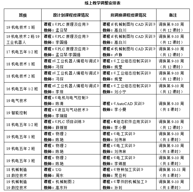 受疫情影响,公司开学时间延长,必发集团为了缓解开学后多门课程使用同一实训室的问题,提高实训场所的使用率,现对部分班级的理实一体化课程与实训课程进行调换,实训课程理论部分开展线上教学。后期根据员工具体返校时间,合理调整剩余课时安排。具体安排如下表。