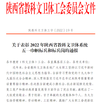 近日,《关于表彰2022年陕西省教科文卫体系统五一巾帼标兵和标兵岗的通报》(陕教科文卫体工字〔2022〕19号)正式公布。必发集团机电系获得”陕西省教科文卫体系统五一巾帼标兵岗“荣誉称号。