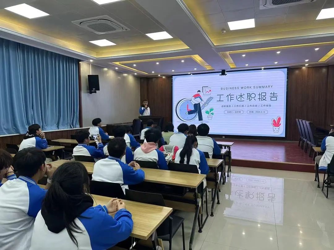 各部门团学干部以回顾过往、立足当下、面向未来为线索进行汇报,总结上学期的工作经验和特色亮点,剖析存在的问题和不足之处,提出了相应的改进措施,明确了下一步的工作方向和目标。他们用精彩的PPT、详实的数据和生动的案例,向大家展示了他们的努力和付出。两位老师对各位团学干部的述职汇报给予评价并提出改进意见。