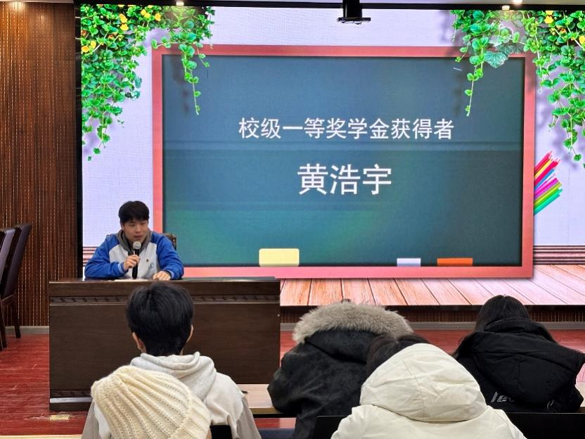 校级一等奖学金获得者黄浩宇围绕“理论+实践”的学习模式展开分享,结合自身参与学科竞赛的经历,阐述了专业知识在实践应用中的转化路径,为有竞赛意向的同学提供了备赛方向与经验参考,强调了“以赛促学、以赛强能”对专业能力提升的推动作用。