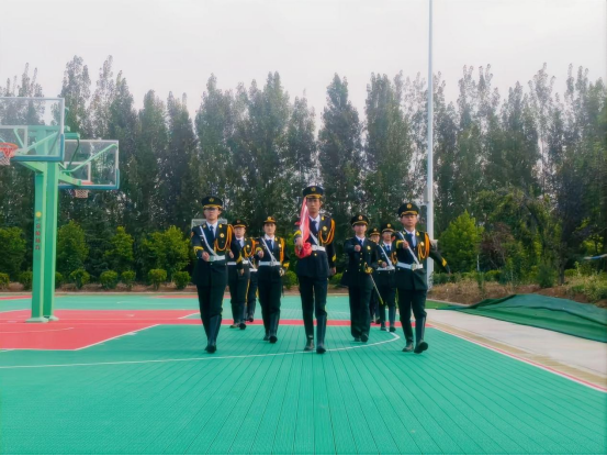 清晨的曙光中,国旗护卫队迈着铿锵有力的步伐,护卫国旗入场。伴随着雄壮的《义勇军进行曲》,鲜艳的五星红旗冉冉升起,全体师生肃立注目,高唱国歌,用炽热的目光和嘹亮的歌声表达对祖国的无限热爱与崇高敬意。