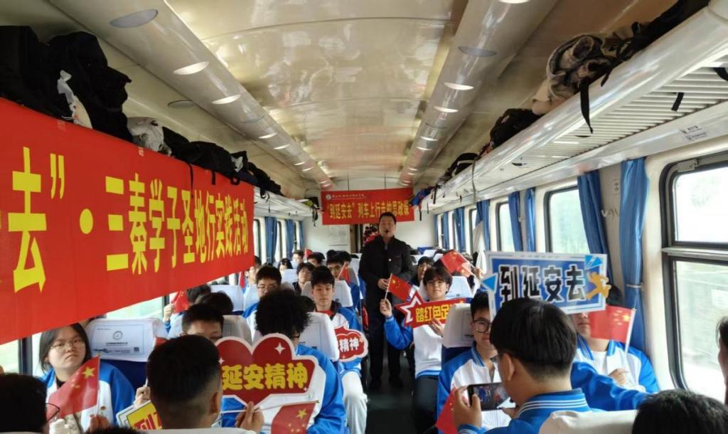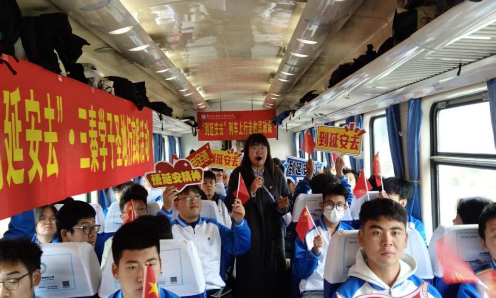 活动首日,伴随着列车的前行,研学之旅在一声汽笛中正式启程。为充分利用旅途时间,将思政教育贯穿全程,一场别开生面的“行走的思政课”在车厢内热烈开讲。在林妍君老师和石刚老师的联合主持下,课堂氛围严肃而活泼。老师们围绕延安时期的历史背景、核心事件以及“自力更生、艰苦奋斗”的延安精神内涵进行了深入浅出地讲解。同学们认真聆听,积极互动,窗外是飞速掠过的黄土高原,车内是思想火花的热烈碰撞。这堂特殊的移动课程,不仅深化了同学们对延安精神的理性认知,更让奔赴革命圣地的旅程本身成为了一次追寻初心的精神洗礼。