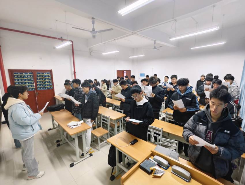 晨读期间,各班学习委员有序组织,同学们手持宪法晨读资料,齐声诵读宪法核心条款。琅琅书声中,宪法条文如春风化雨,悄然浸润学子心田。