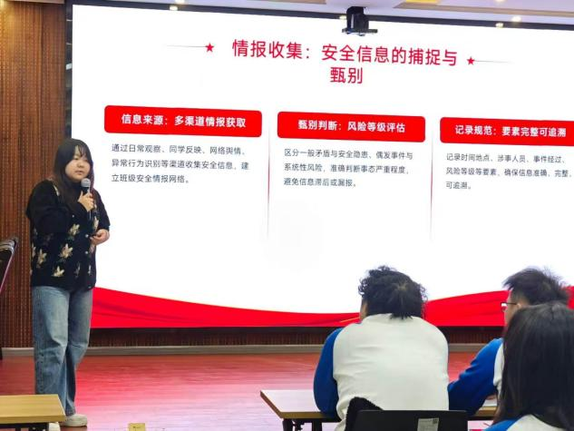 培训会上,岳汪洋老师围绕身心健康、宿舍安全、人身安全、网络与财产安全、学业与实习就业安全、情感人际关系等六大方面进行了系统讲解。他强调,班级安全班干部要树立“安全第一、预防为主”的意识,及时发现并上报班级内的安全隐患,做到“早发现、早报告、早干预”。